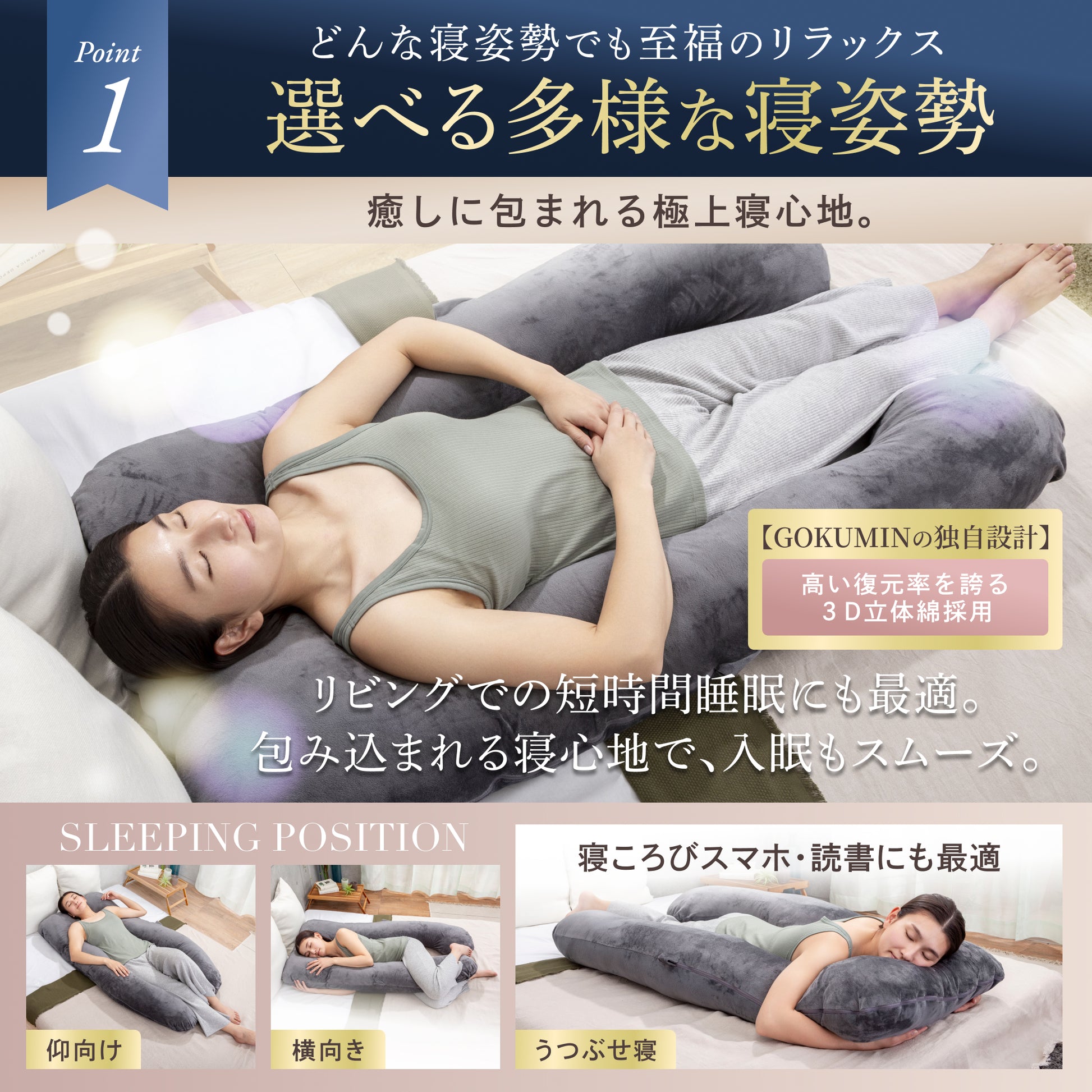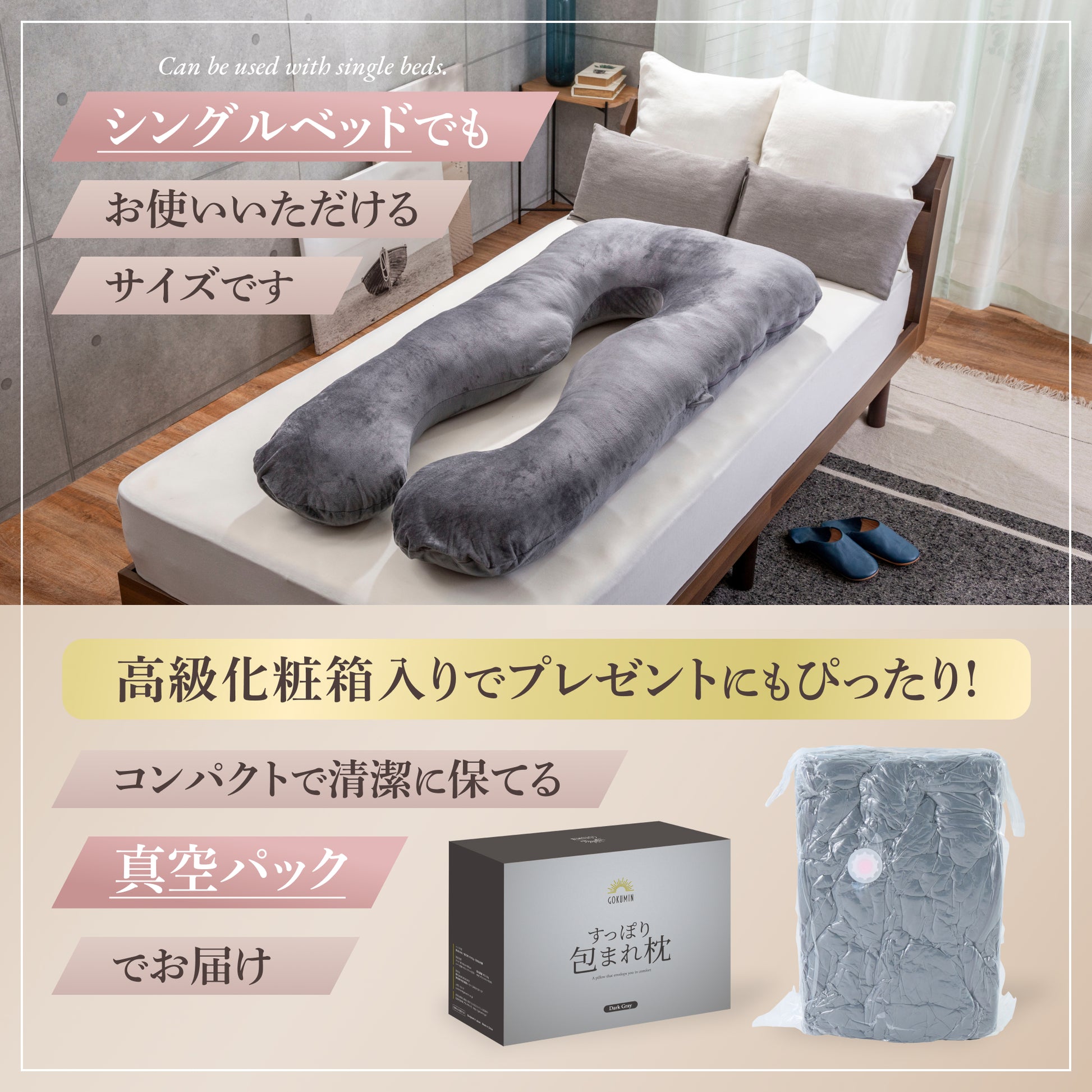 GOKUMINから待望の抱き枕が登場しました!一回り大きめで体を優しく包み込み、心も体もリラックスさせてくれます。友達にプレゼントしたところ、授乳クッションとして大活躍しているそう。抱き枕だけでなく、いろんな用途でお使いいただけますよ!