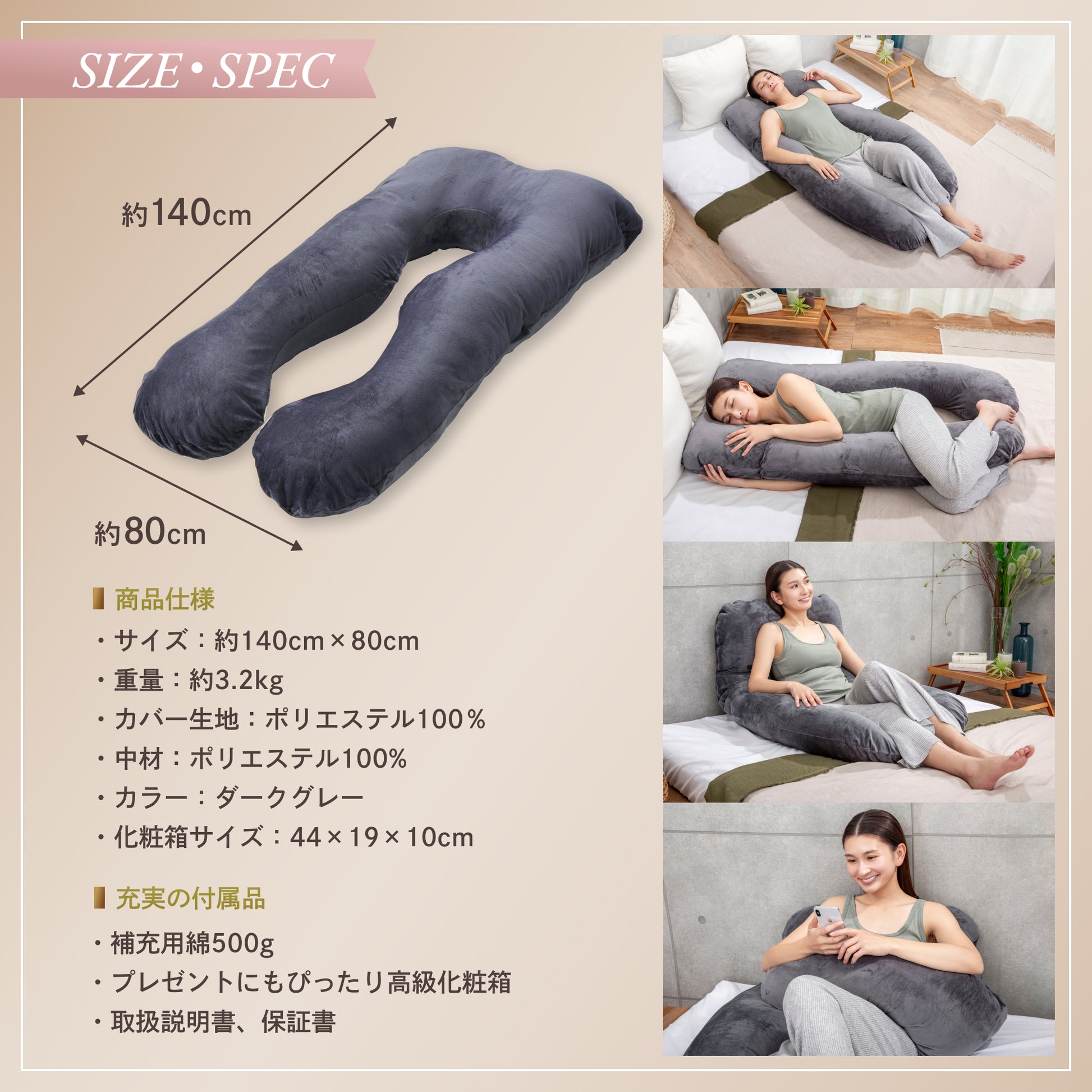 独自のU字型デザインと高弾力の素材が体をしっかりと支えます!女性や妊婦さんはもちろん、男性にもぴったり。妊婦枕や授乳クッション、背もたれクッション、足枕、腰枕など、様々な用途でお使いいただける多機能枕です。