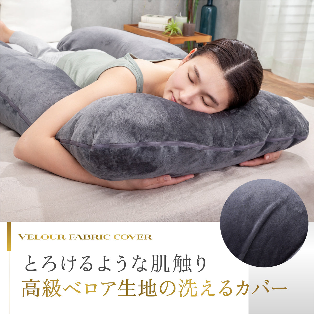 高級感のある柔らかなベロア生地のカバーを使用しています。さらに、カバー生地には抗菌・防臭加工が施されており、細菌の繁殖を抑え、気になる臭いを防ぎます。