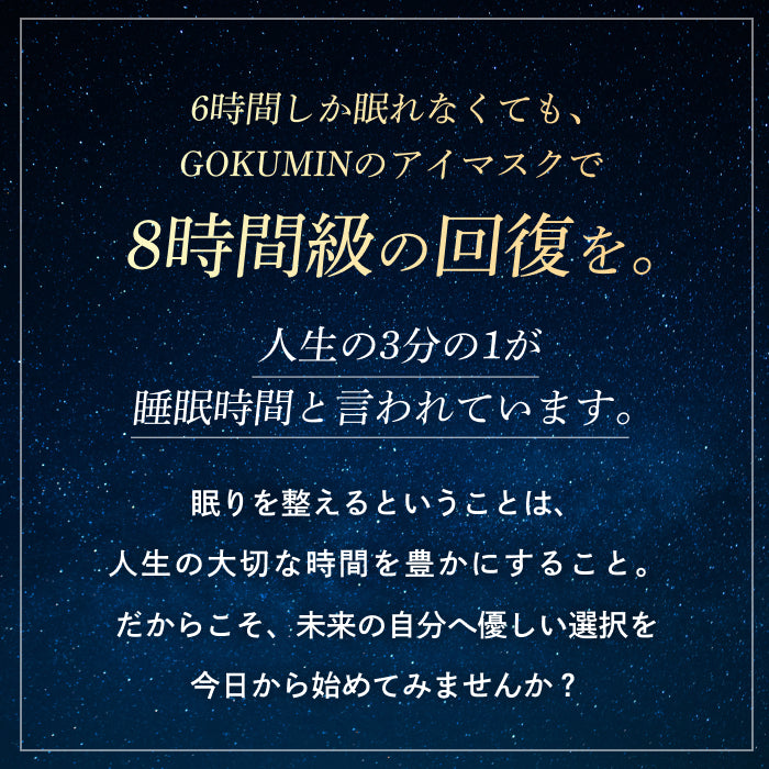 光や圧迫感、不快な装着感といった睡眠の妨げになる要素を一つひとつ見直し、快眠のために本当に必要な機能だけを追求して開発されました。遮光性、肌へのやさしさ、使いやすさのすべてに妥協せず、毎日自然と手に取りたくなる一枚を目指しています。眠りの質を大切にするすべての方へ寄り添うアイマスクです。