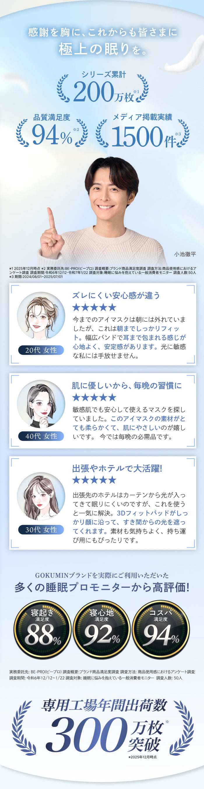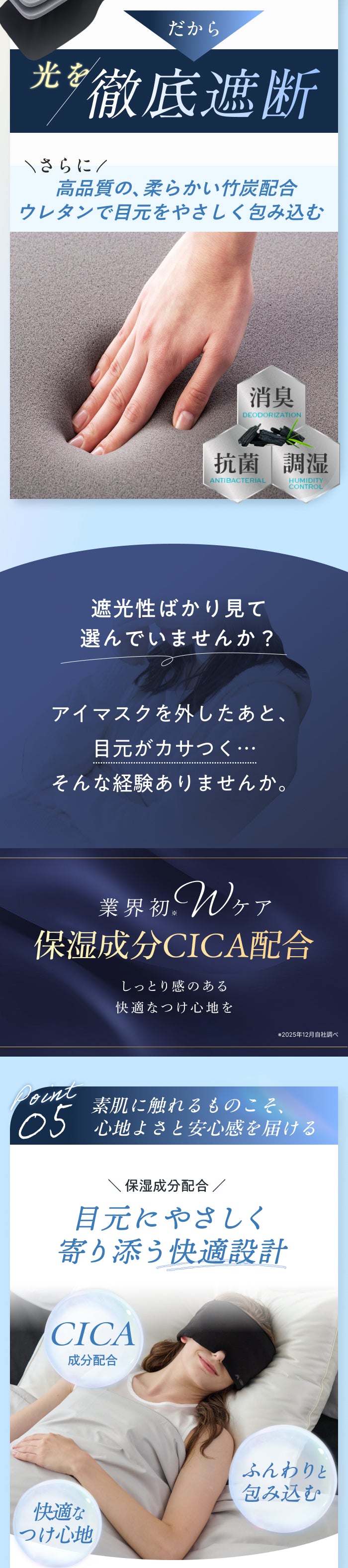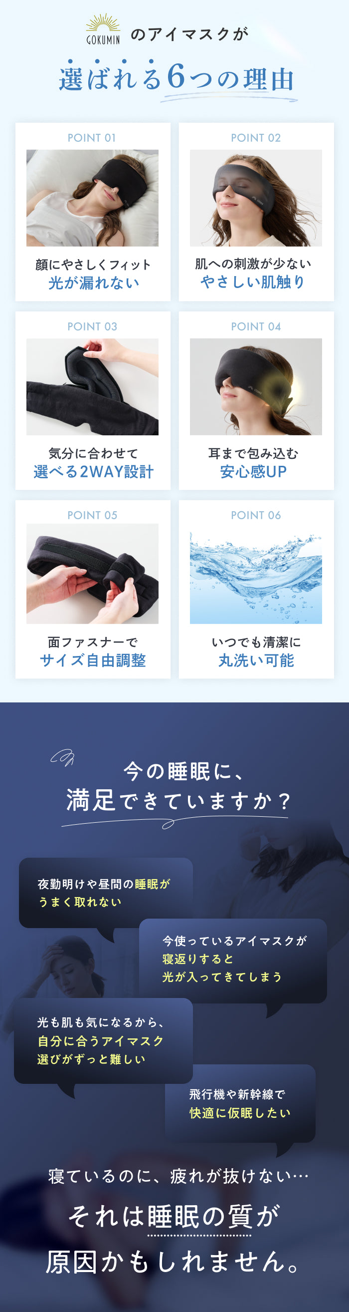 仕事や家事で疲れている日は、わずかな光でも気になりがちですが、ナイトロックは目元まで包まれる感覚が心地よく、自然とリラックスできます。3Dパッドを外すと軽く使えるので、その日の体調や眠りの深さに合わせて選べるのが便利。朝まで快適に使えました。