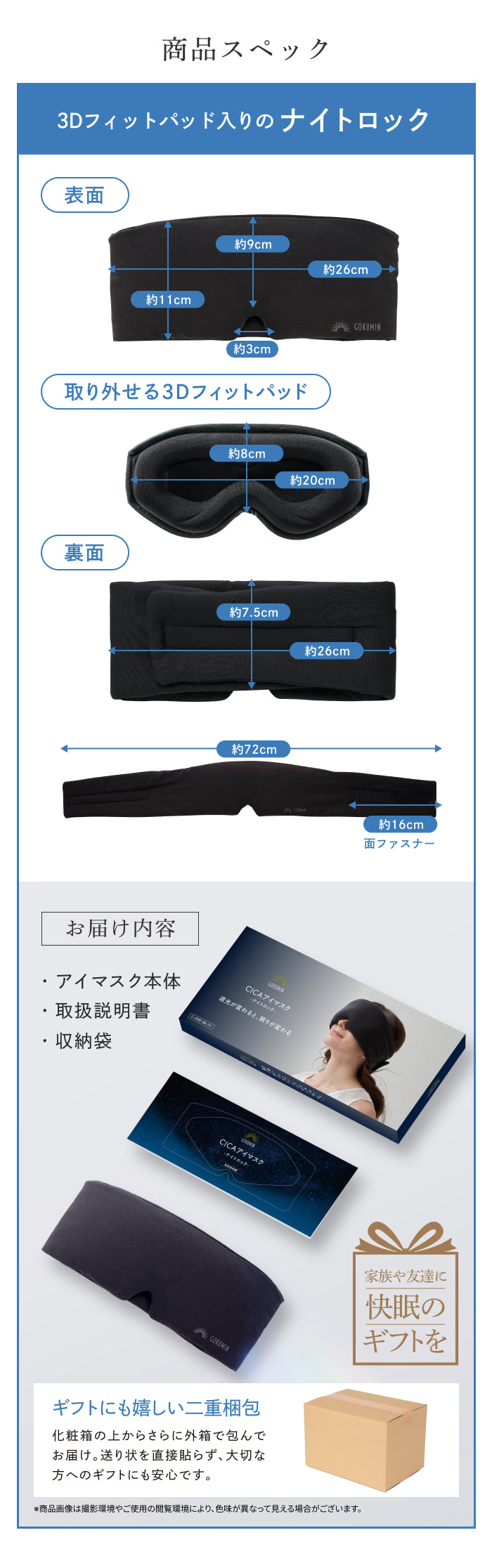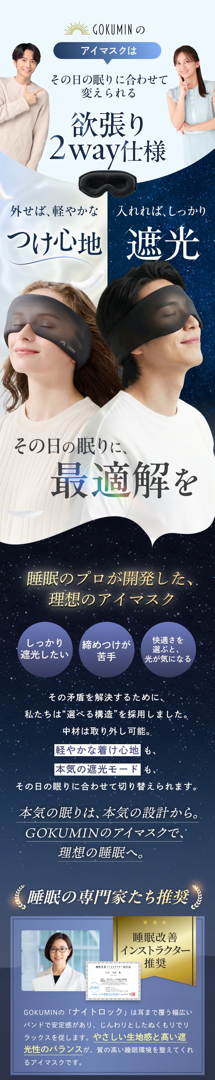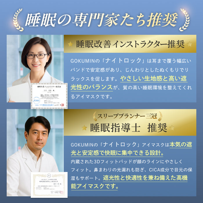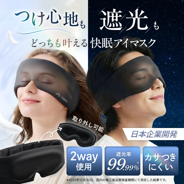ナイトロックは、GOKUMINオリジナル構造によって使い心地を選べる2way仕様のアイマスクです。内蔵された3Dフィットパッドは取り外し可能で、遮光性を重視したい日はパッド入り、軽さやリラックス感を求める日はパッドなしと、お好みや気分に合わせて使い分けができます。
