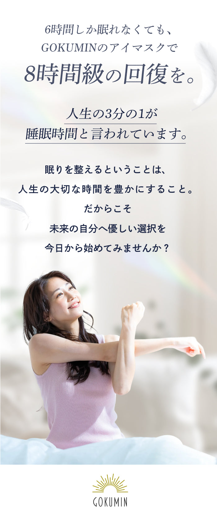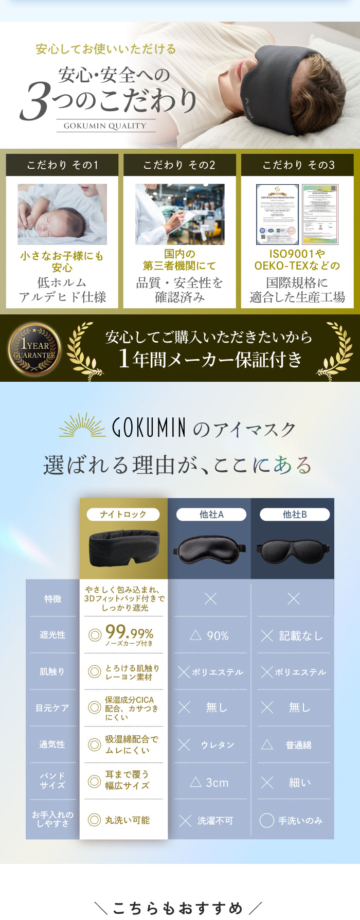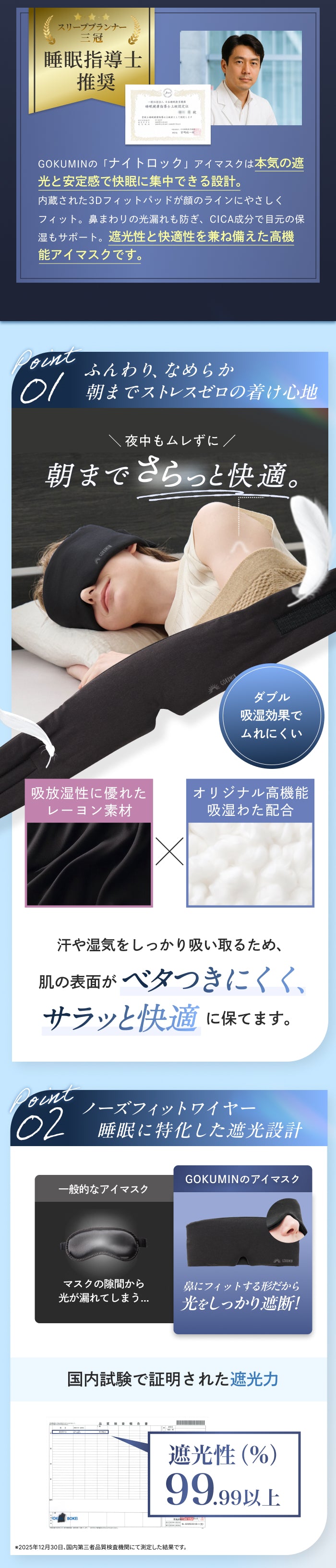 私たちは「その日の眠りに合わせて選べる快適さ」を形にするため、ナイトロックを開発しました。遮光性・肌触りを一方的に押し付けるのではなく、使う人自身が選べる2way構造を採用。自宅での就寝から移動中、短時間の仮眠まで、あらゆるシーンで心地よい眠りを届けるためのアイマスクです。