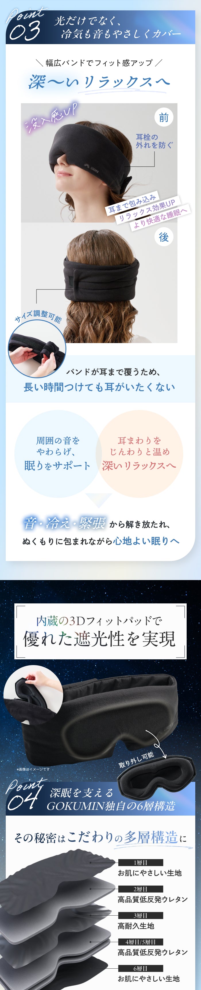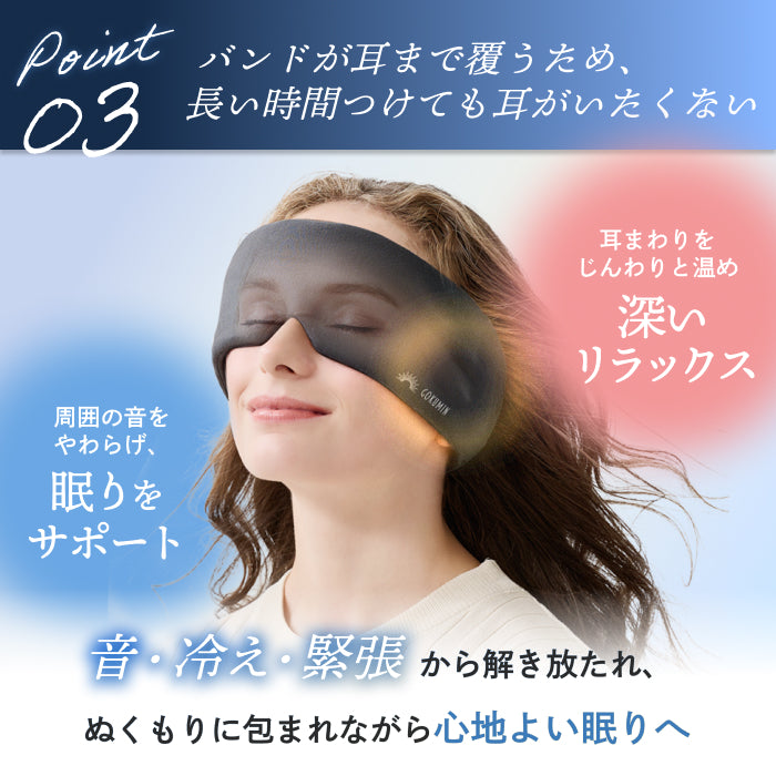 幅広設計のバンドが耳まで覆い、生活音をやわらかく軽減。耳元を温めることで緊張が和らぎ、リラックスした状態へ導きます。サイズ調整が可能なため締め付け感が少なく、耳が痛くなりにくいです。静かでぬくもりのある空間をつくり、落ち着いた眠りをサポートします。