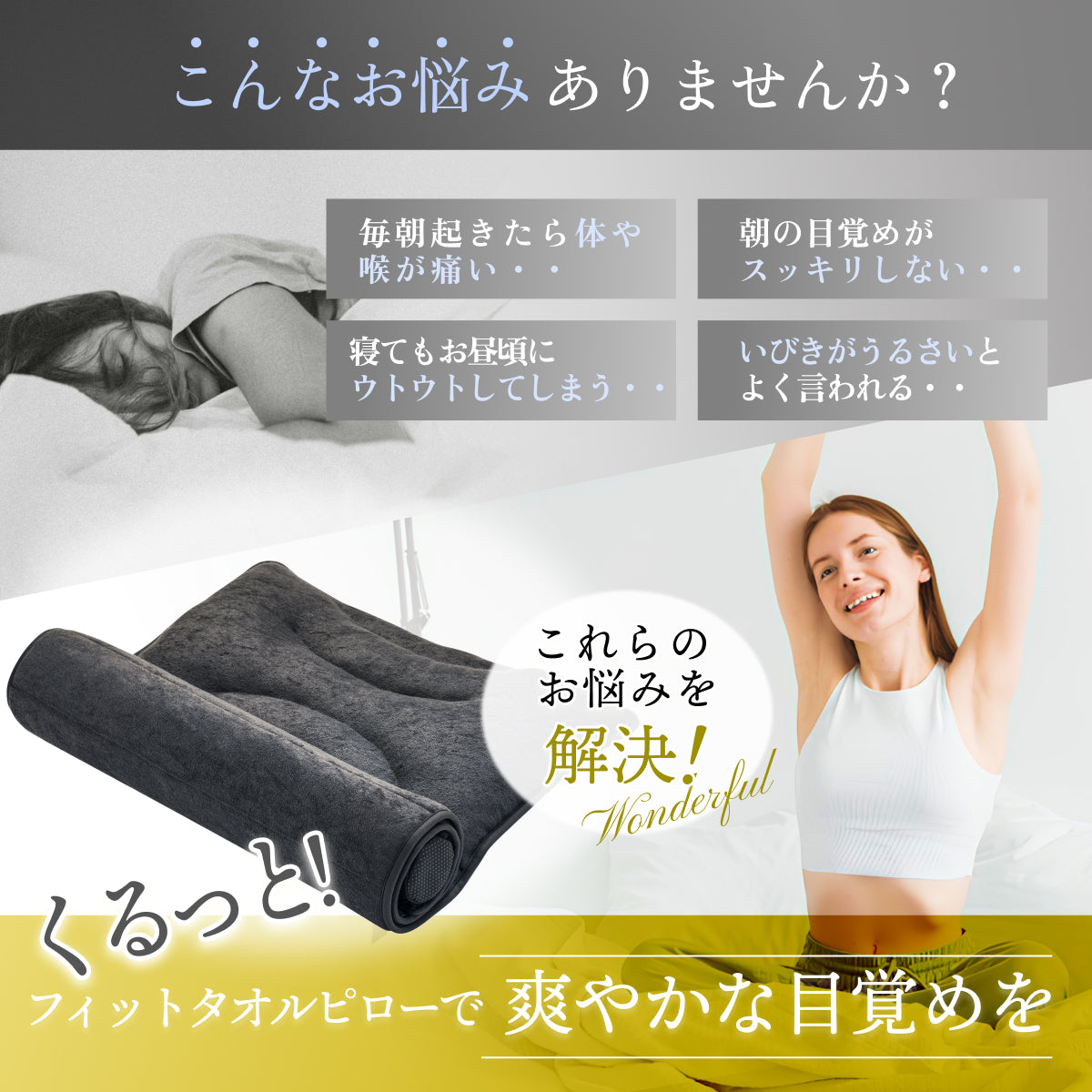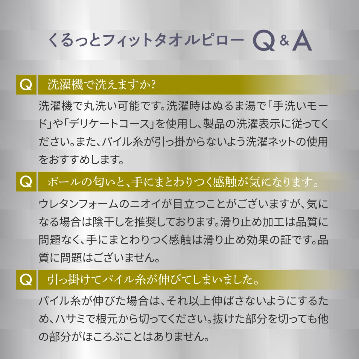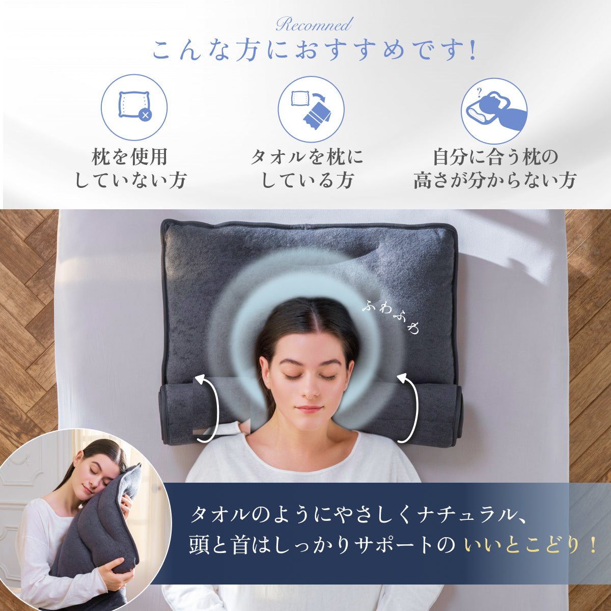くるくるふんわり、タオル生地のやさしさに包まれる枕です。普段は「枕をご使用されていない方」、「肌触りの良いふんわり素材」で自分に合う枕を探していた方へ最適。ストレートネック対策に毎日タオルで枕を作っている方へもおすすめです。自由度と使いやすさと寝心地ででストレスを軽減し、これまでにない心地よさと柔軟さで、あなただけの快適な眠りへ導きます。