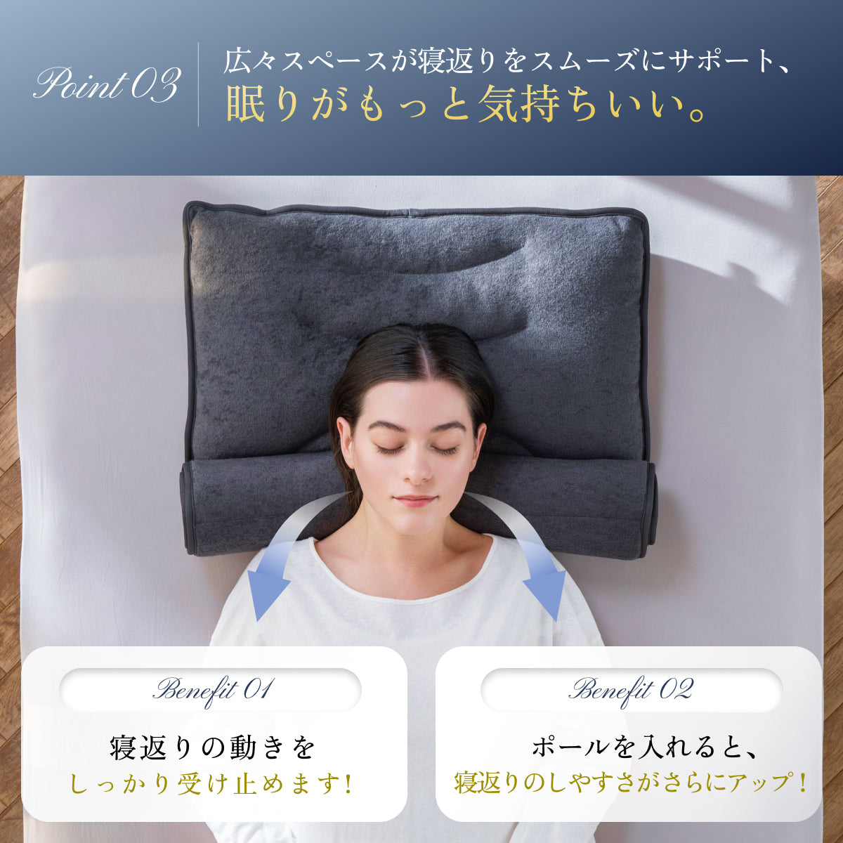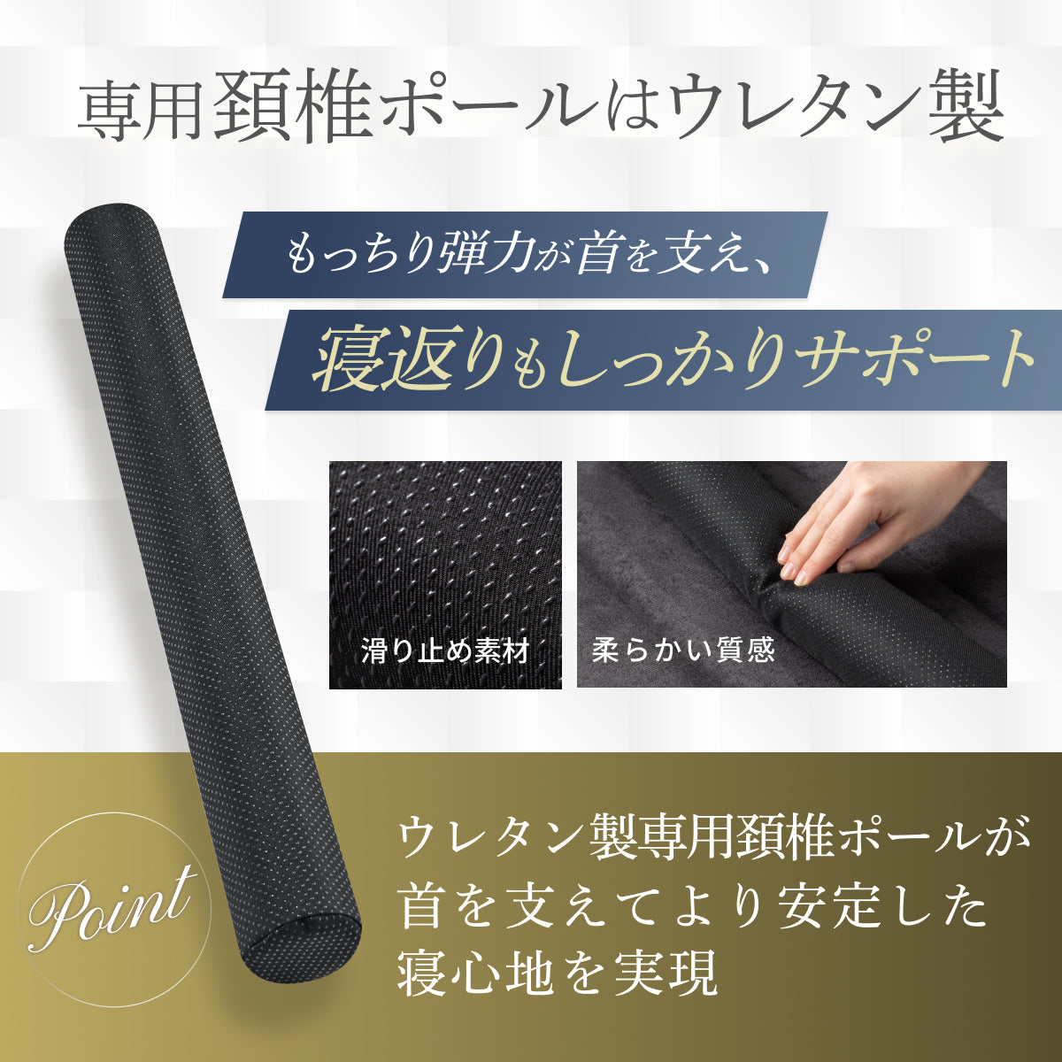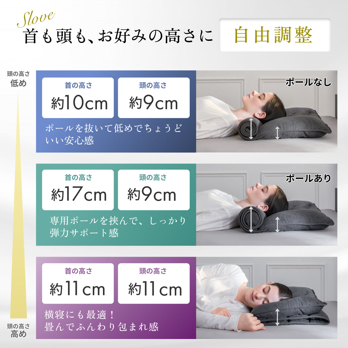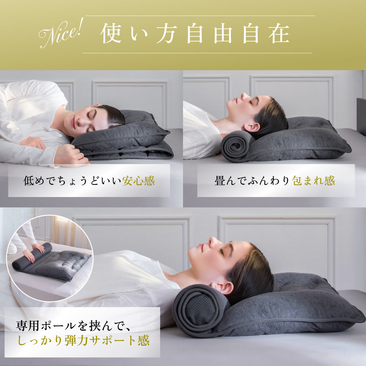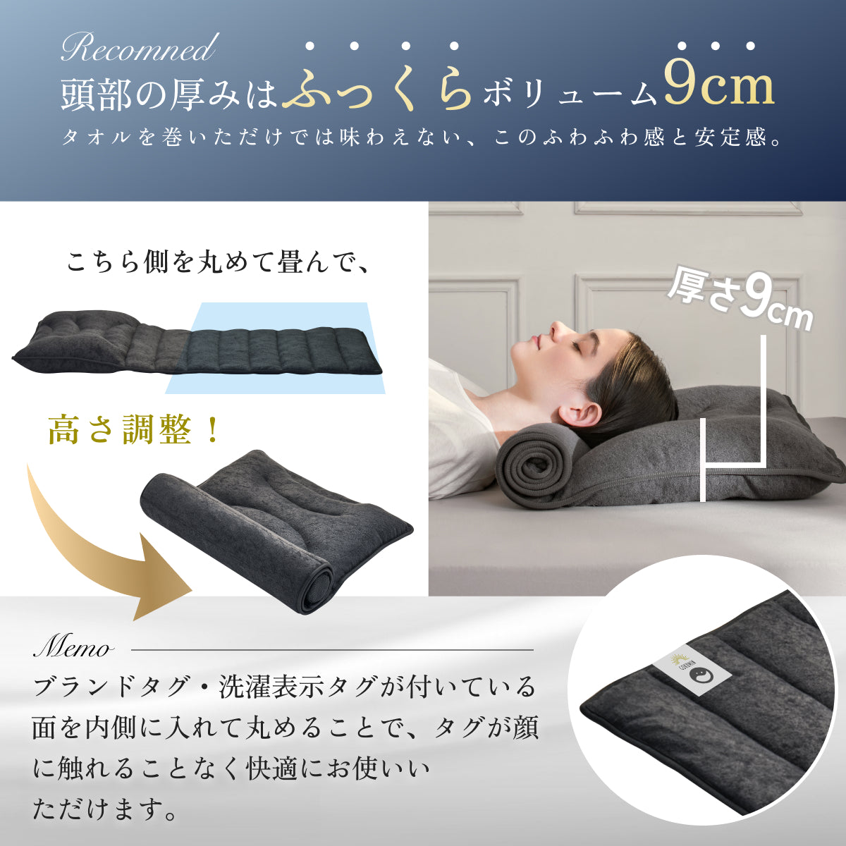 肌なじみの良いタオル素材にたっぷりの綿を加えることで、ふんわり柔らかな仕上がりに。タオルを巻くだけでは得られない快適さに加えて、専用ポールを挟むことで頸椎をしっかりサポート。毎晩の眠りが、特別な癒しの時間に変わります。