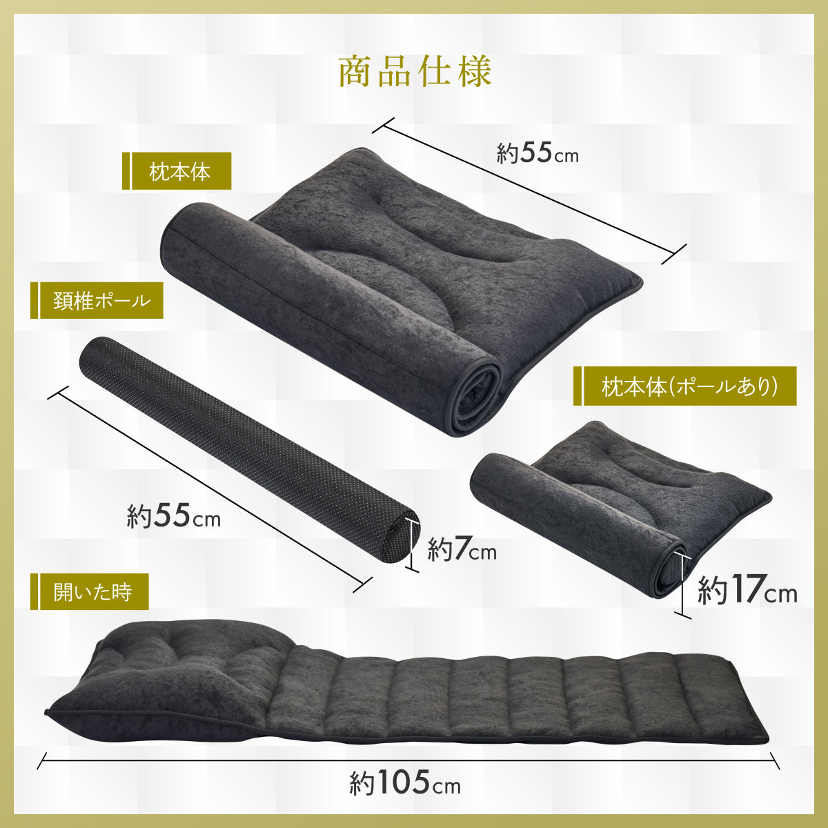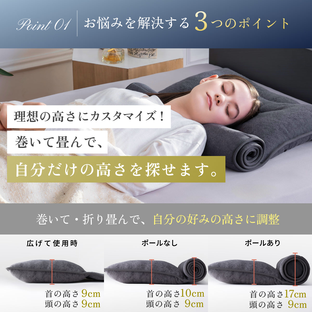 くるっと丸めて頸椎をサポートしたり、折り畳んで高さを調整したり、使い方は思いのまま。ポールを入れずに巻けば首部分10cm、ポールを入れて巻けば17cmの高さになります。そのままシートとして眠れば、寝汗対策にも!毎朝の目覚めが変わる感動をぜひお試しください。