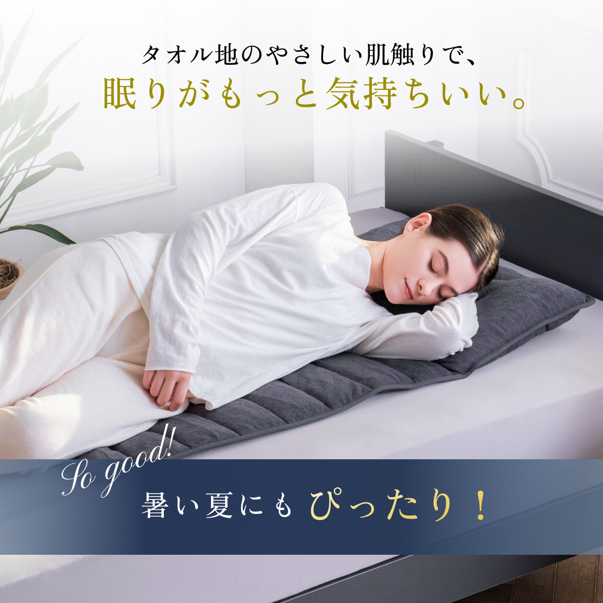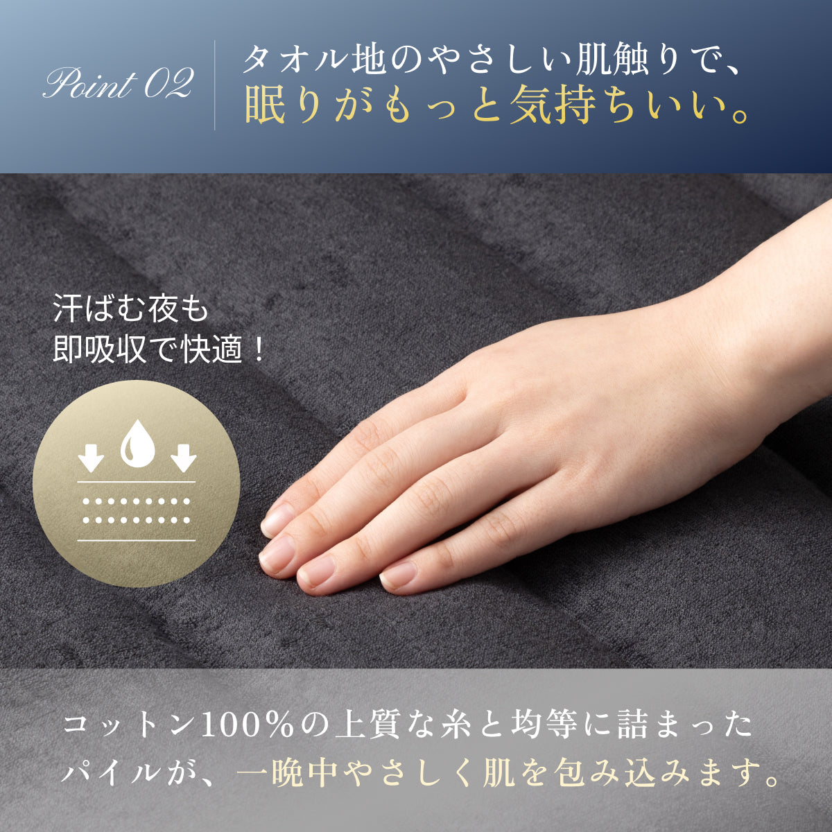 汗をしっかり吸収し、速乾性のあるタオル素材を採用。湿気の多い季節や汗ばむ夜でも快適な使い心地をキープします。さらに丸洗い可能!汚れや汗を気にせず清潔を保つことができます。風通しの良い場所で乾かすだけで、ふんわり感も長持ちします。ISO認定工場での国際基準に基づく品質管理を実施。日本企業開発で購入後も万全のサポート体制です。