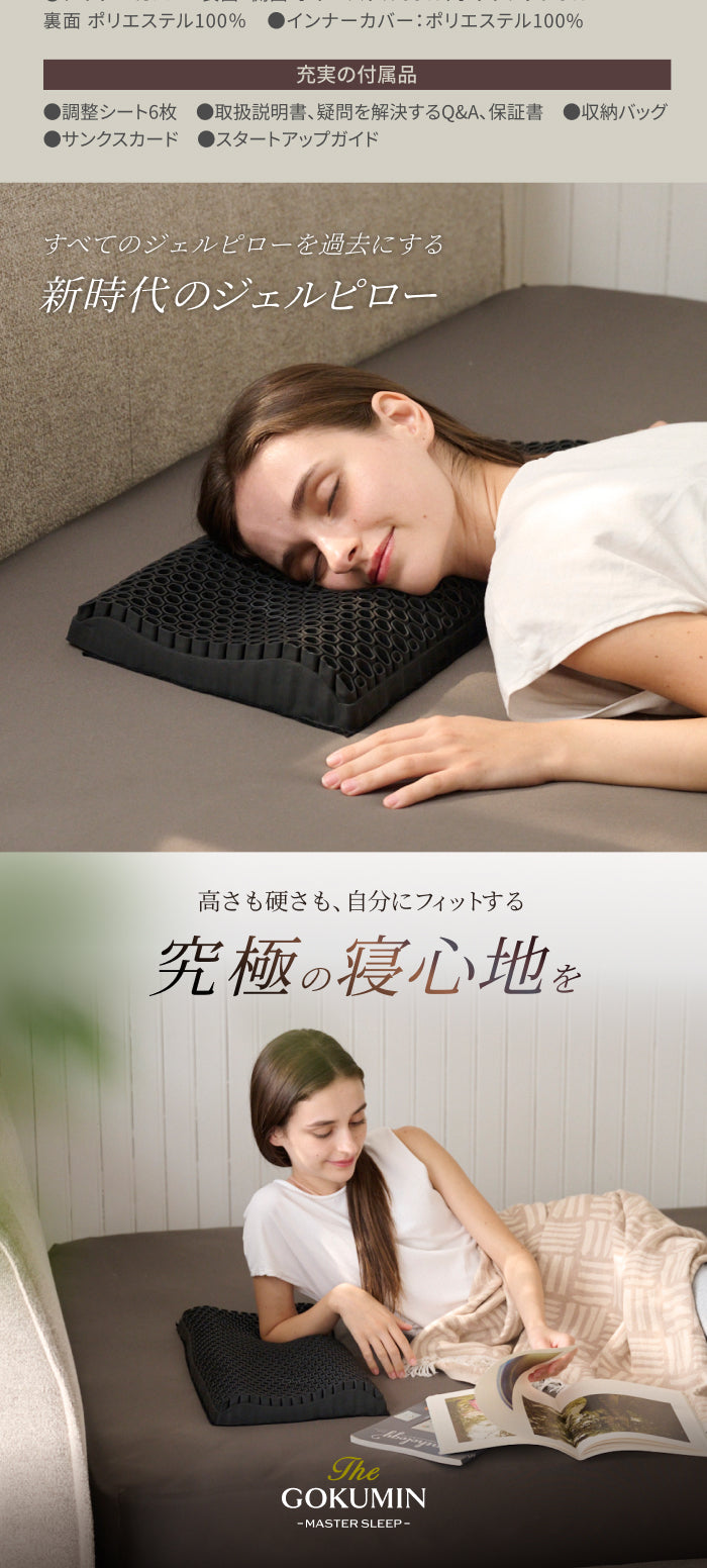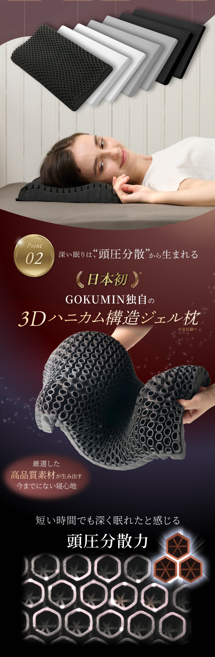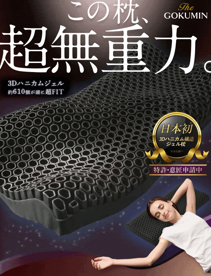 「誰もが“本当に休まる睡眠”を手にしてほしい」その想いからGOKUMINは、長年の睡眠研究と素材開発を重ね、超無重力ジェルピローが完成しました。頭圧分散・通気性・復元力の三拍子を揃え、あなたの眠りを科学するブランドとして進化を続けています。