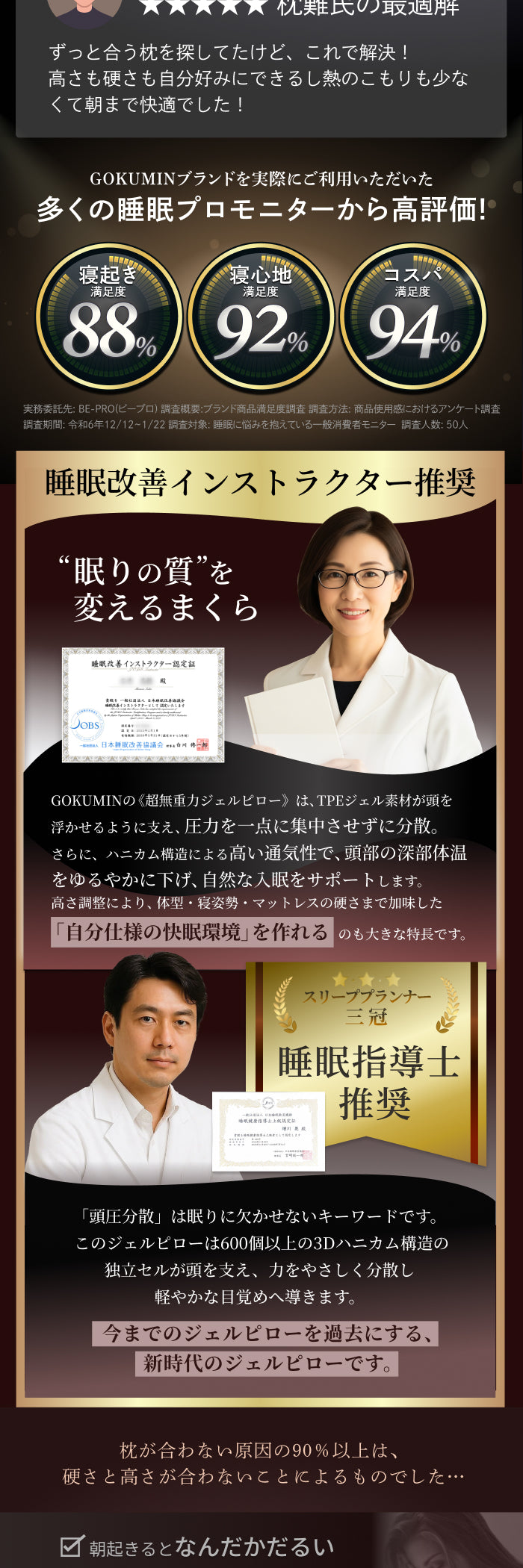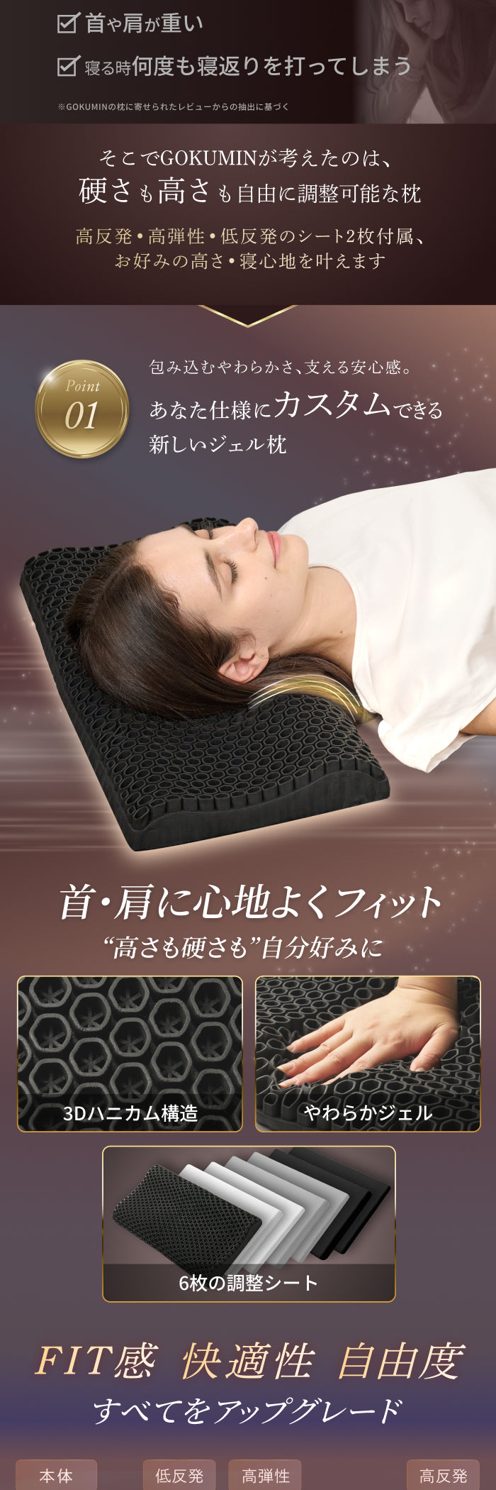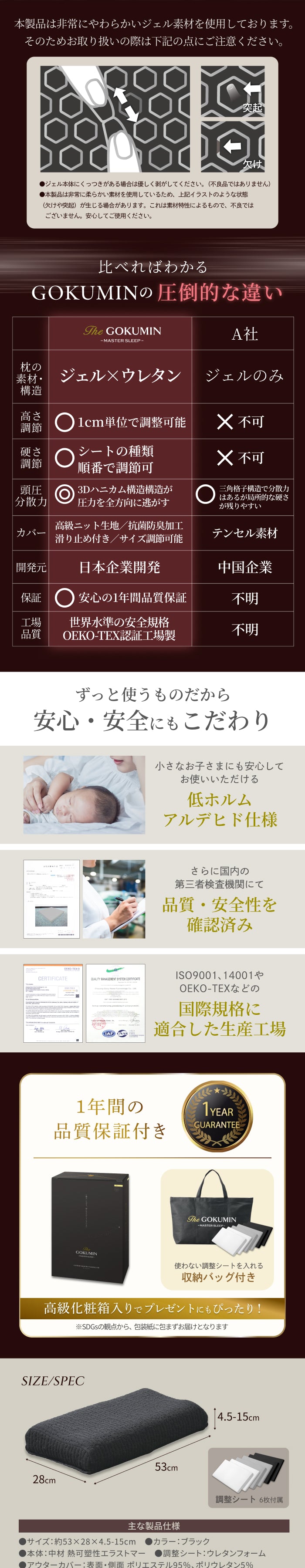 「誰もが“本当に休まる睡眠”を手にしてほしい」その想いからGOKUMINは、長年の睡眠研究と素材開発を重ね、超無重力ジェルピローが完成しました。頭圧分散・通気性・復元力の三拍子を揃え、あなたの眠りを科学するブランドとして進化を続けています。