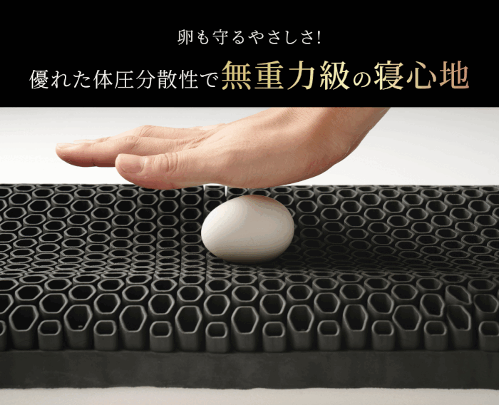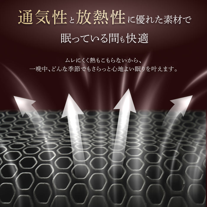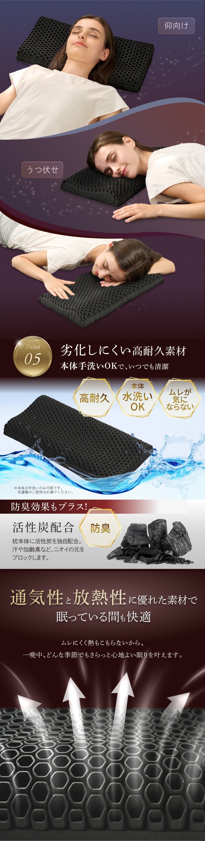 柔らかくもしっかりと支える独自の3Dハニカム構造が無数の接点で頭部を支え、全方位から優しく包み込むことで圧を均等に分散。沈みすぎず浮きすぎない理想的なバランスを生み出し、短時間でも深い眠りを実感できます。まるで専用設計のような安定感が、一晩中自然な寝姿勢をキープします。
