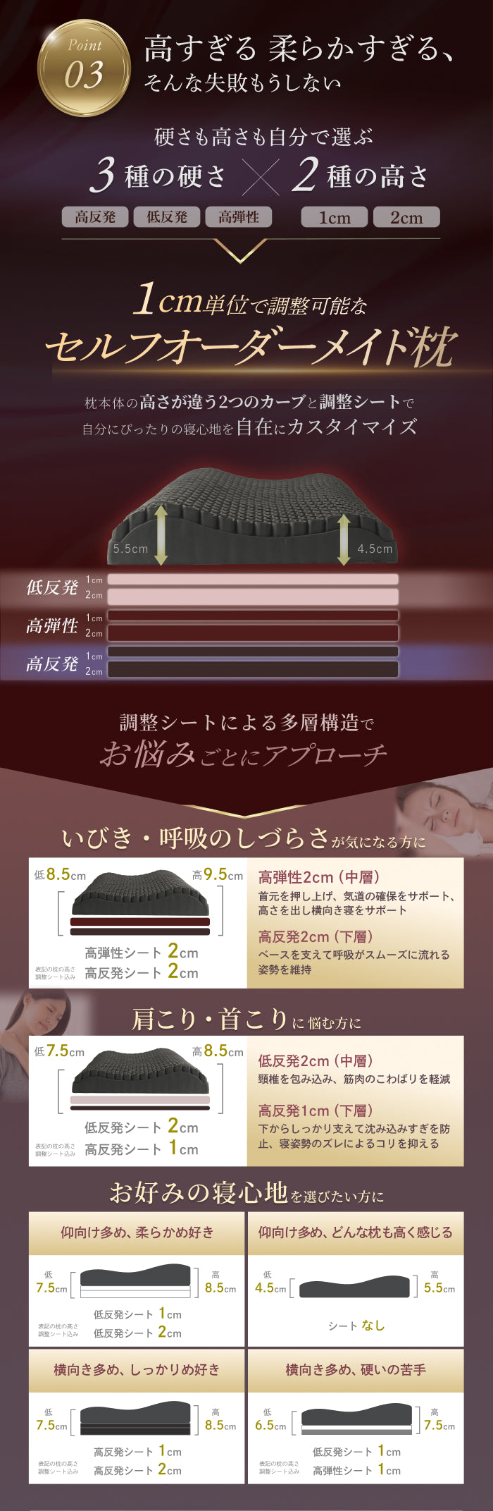3種の硬さ(低反発・高弾性・高反発)と2種の高さ(1cm/2cm)を組み合わせ、1cm単位で理想の寝心地を調整可能。セルフオーダーメイドのように自分好みに設計でき、どんな体格の方にもフィットします。硬すぎず柔らかすぎない、あなた専用の心地よさが手に入ります。