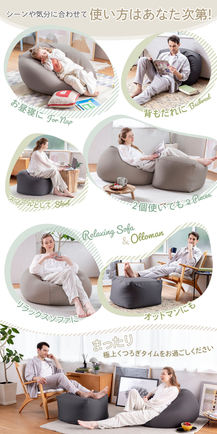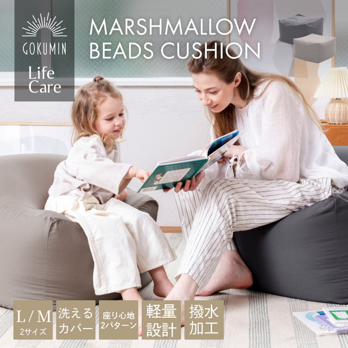 一般的なビーズクッションに多い「カバーが洗えない」「肌触りが固すぎる」「非常に高価」などのデメリット部分を解消!コストを惜しまずGOKUMINは肌触りも耐久性も兼ね備えた「撥水加工」のビーズクッションを作りました。カバーも本体も撥水加工をしているから、食べこぼしにも安心なんです。さらに長く快適に使えるよう、補充方法も2パターンのご用意。汚れにくく洗えるカバー付き&マシュマロ触感をぜひお試しください。