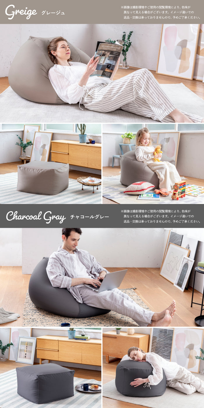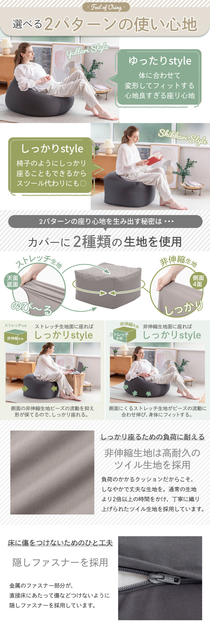 ○本体生地:ポリエステル89%ポリウレタン11% カバー全体撥水加工(側面生地+天面生地)【中材】ポリエチレンビーズ1mm(静電気防止加工)