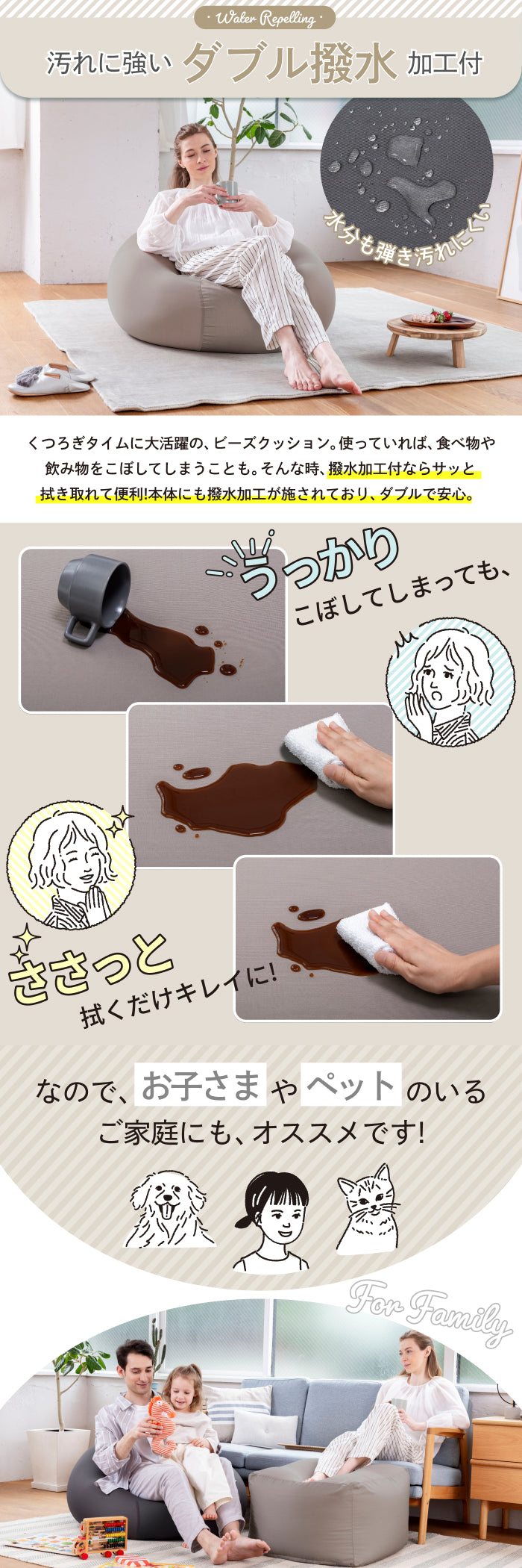 人気のビーズクッションは極小ビーズを使用。食事中にうっかり飲み物や食べ物をこぼしてしまうこともあります。「洗えずに処分した」とのお声にお応えし、「撥水加工付きカバー」なら、すぐに拭き取れて便利です!本体の生地も撥水加工が施されており、ダブルで安心。小さなお子様やペットがいるご家庭にも最適です。
