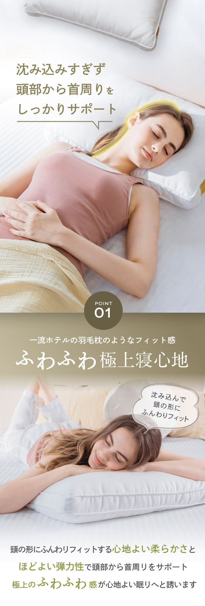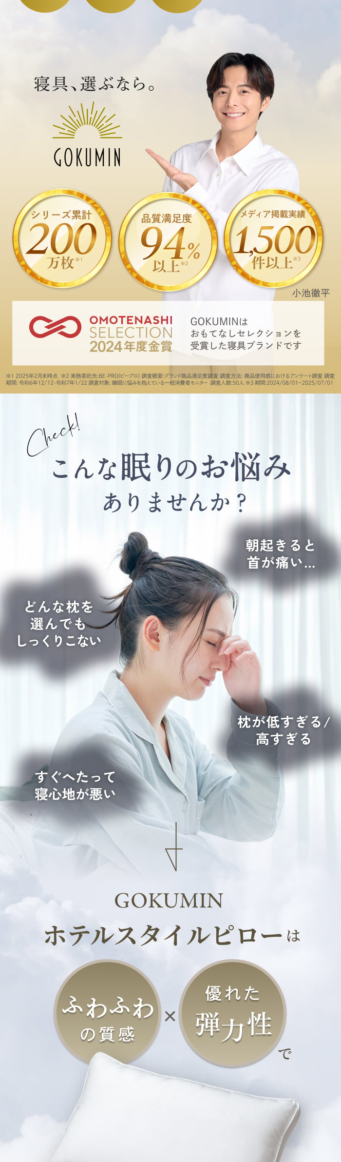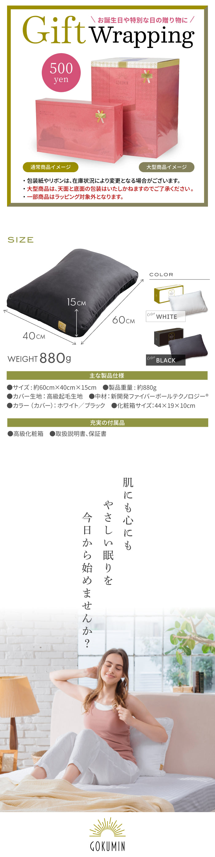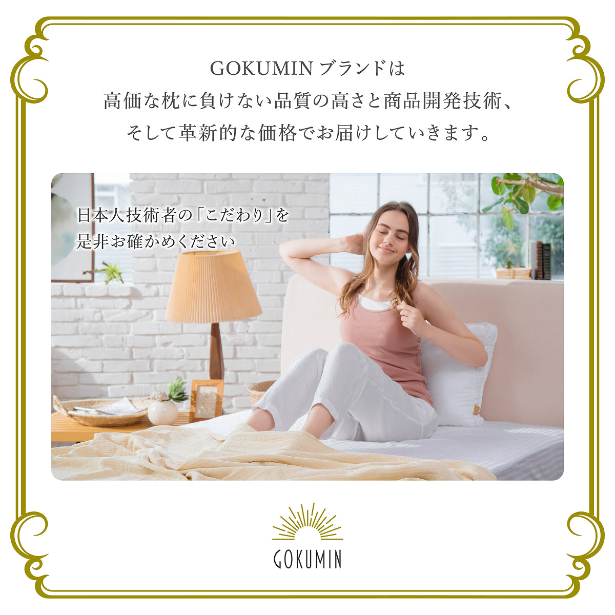 gokuminは、お客様からの要望を受けて、独自の綿製枕を開発しました。ファイバーボールテクノロジーを用いた綿を採用し、弾力性に優れた快適な寝心地を実現。まるで高級ホテルのようなリラックス感が味わえます。