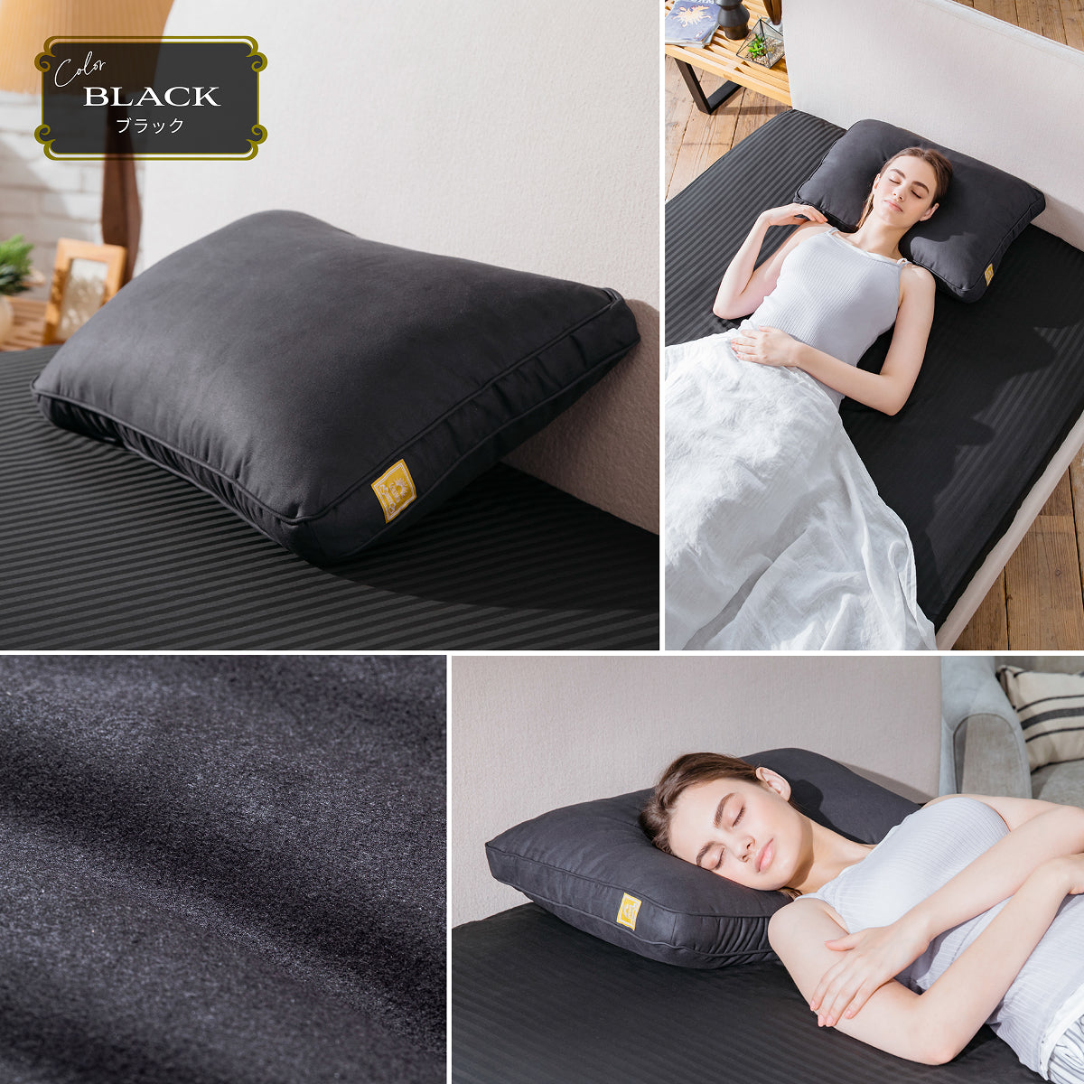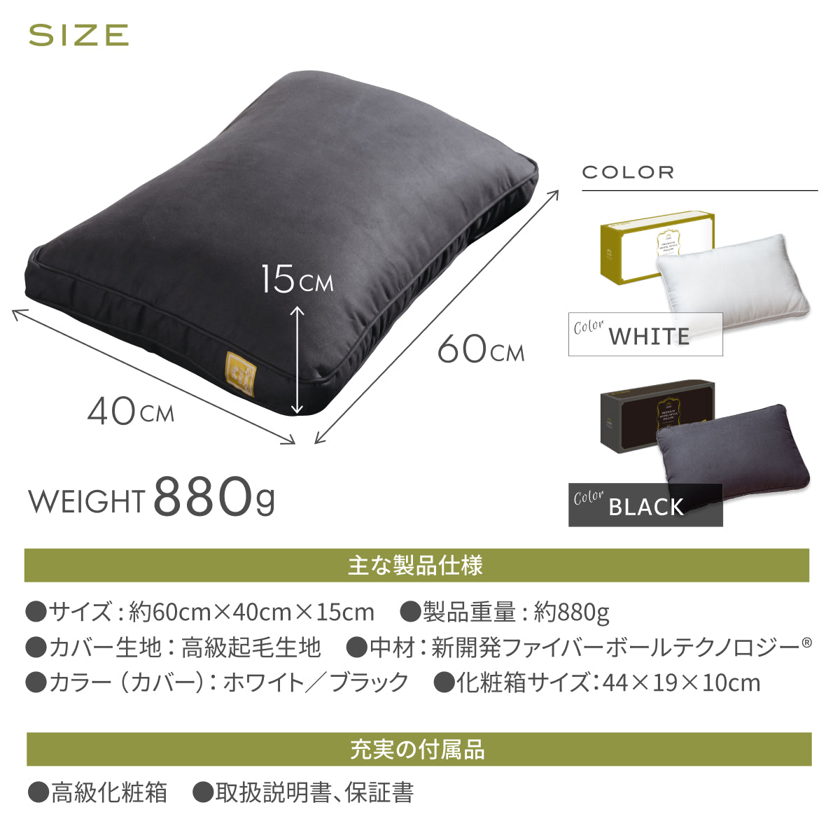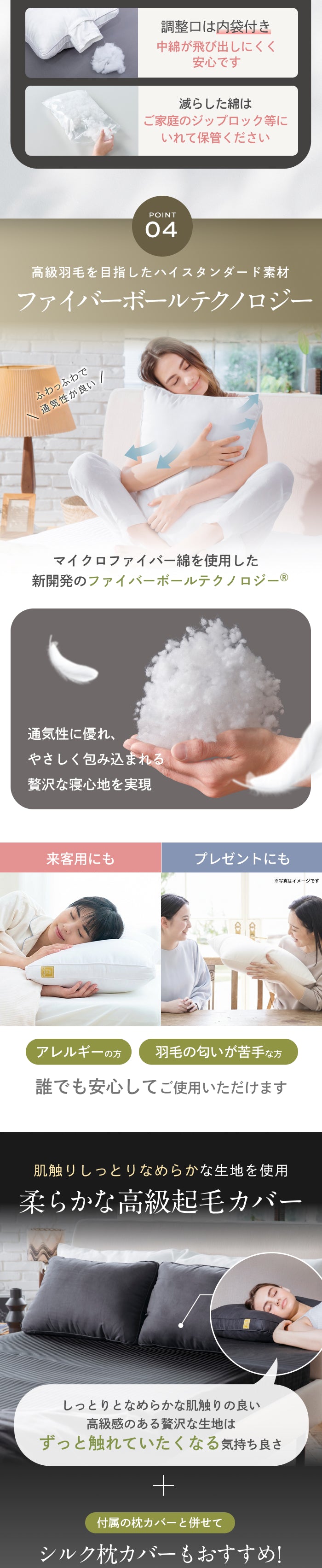 一流ホテルの羽毛枕を目指して開発した、新しい綿枕です。新開発のファイバーボールテクノロジーⓇを使い、ふわふわの質感を実現しました。綿の出し入れで高さと硬さの調整も可能。高級感のあるブラックカラーもご用意しています。