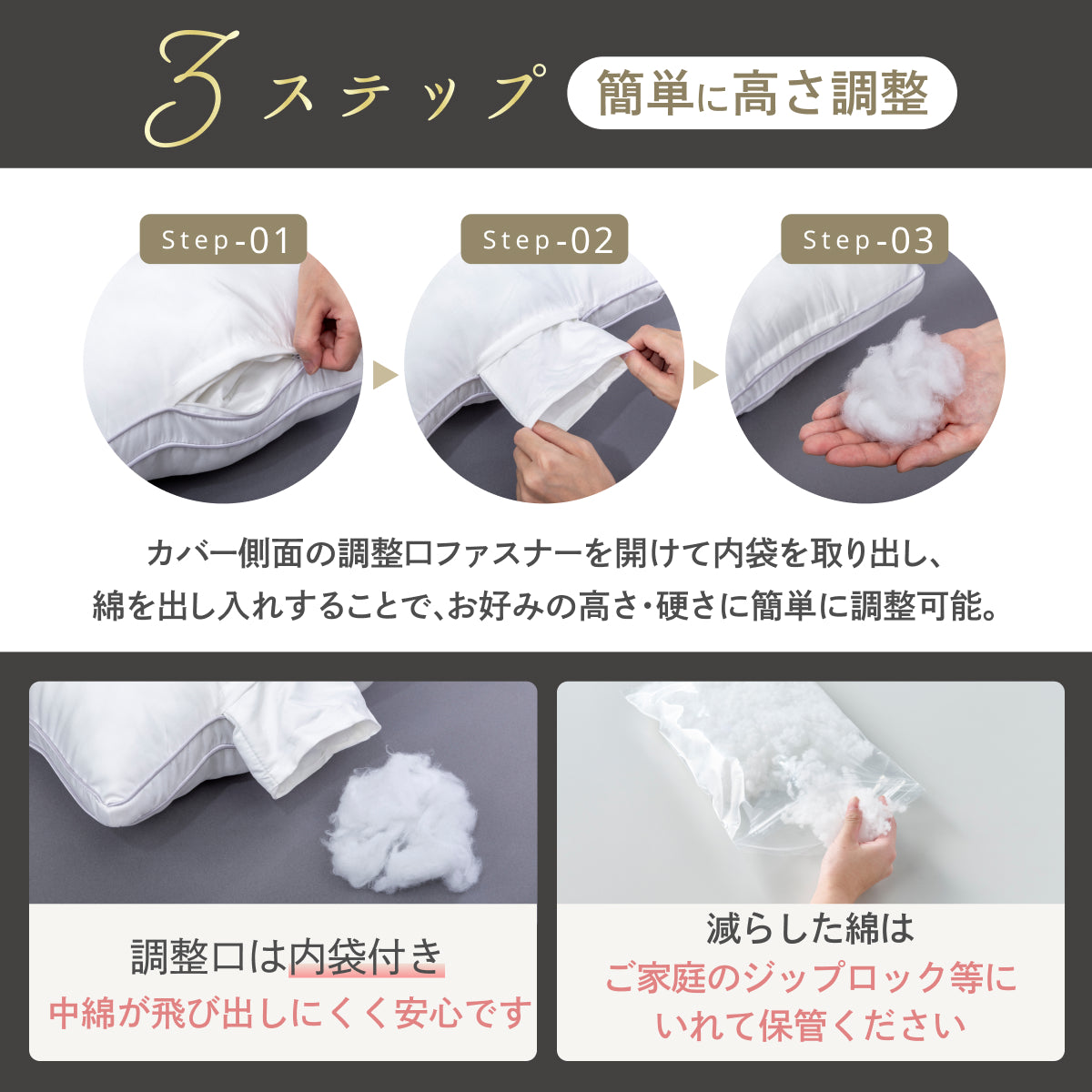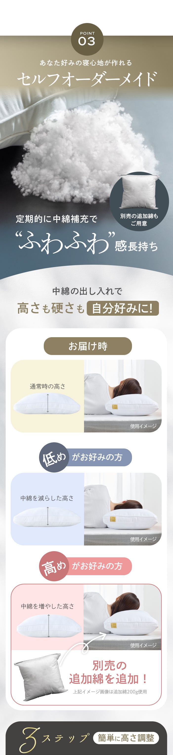 枕の高さに困ったことはありませんか?この枕は、ファスナー付きの構造を採用しており、お客様自身で綿の量を調整することで、高さを自由に変更できます。これまで高さに悩んでいた方にはぴったりのアイテムです。