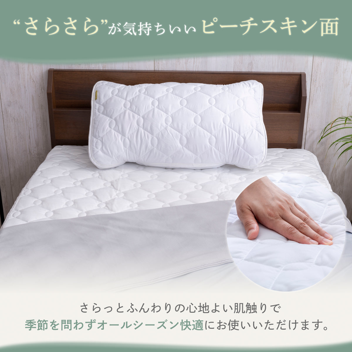 夜間の熱中症対策にぴったり!表地は熱伝導率が高く、肌に触れるとひんやりとした感覚が得られます。Q-Max値は0.35で、一般的な寝具の3倍のひんやり感を実現。冷たすぎるのが苦手な方のために、独自のブレンド生地を採用しています。冷房と併用することでさらにひんやり感が持続し、寝返りを打つたびに快適さが続きます。裏面は柔らかなピーチスキン素材を使用しており、優れた吸水速乾性を持ち、心地よく安眠をサポートします。両面使用できるため、季節や好みに応じて1年中使えるお得なアイテムです。