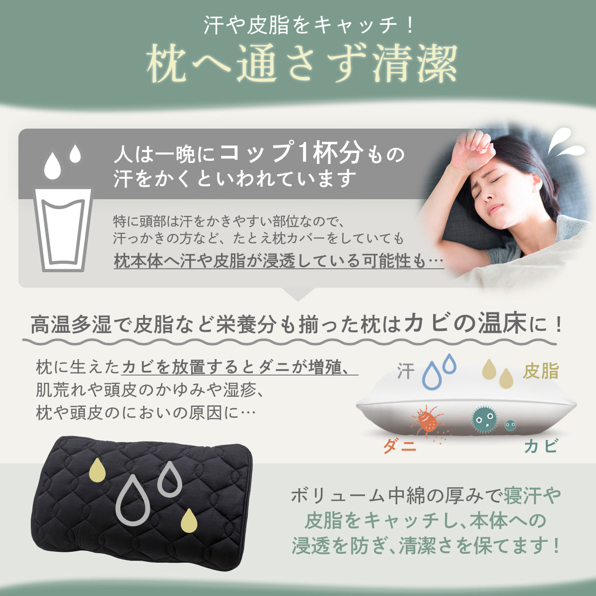 中綿の厚さは200g/m2で、一般的な枕パッドの2倍以上のボリュームを持ち、贅沢な寝心地を提供します。頭部は汗をかきやすく、菌が増殖しやすい場所でもあります。この枕パッドは、「あせもや肌荒れ」、「頭皮のかゆみやニオイ」を引き起こす寝汗や皮脂をしっかり吸収し、枕への浸透を防ぐことで清潔さを保つことができます。
