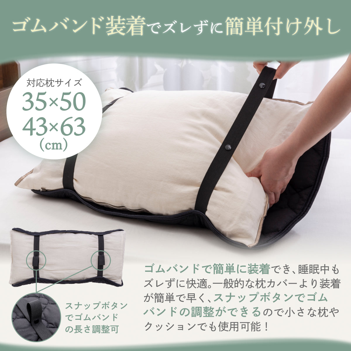 ゴムバンドを使用しているので、枕カバーよりも装着が簡単です!寝返りを打ってもズレる心配がなく、快適に眠れます。35×50cmや43×63cmの一般的な枕に対応しており、スナップボタンでゴムバンドの調整が可能です。小さな枕やクッションにも利用でき、さまざまな用途で活躍します。ゴムバンドは生地と同色で揃えており、見た目にも配慮されています。