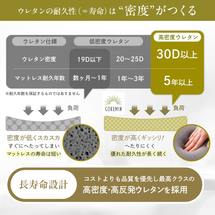 各販売サイトで高評価のスプリングマットレスです。中のウレタンは高品質・高耐久性があり、スプリングも耐久性を重視して開発しました。腰痛持ちの方、硬めのマットレスが好きな方には特に気に入っていただける自信ありです!