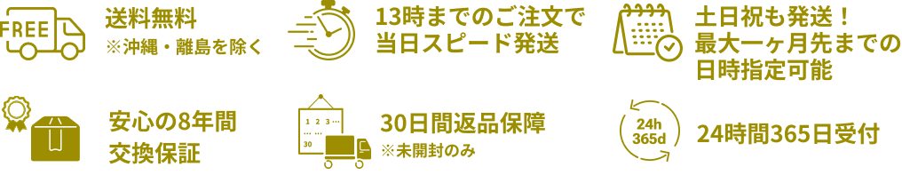 購入後8年間、メーカー直営の品質保証が付いています。初期不良や使用中の不具合に対しても、万全のサポート体制が整っているため、安心してご使用いただけます。