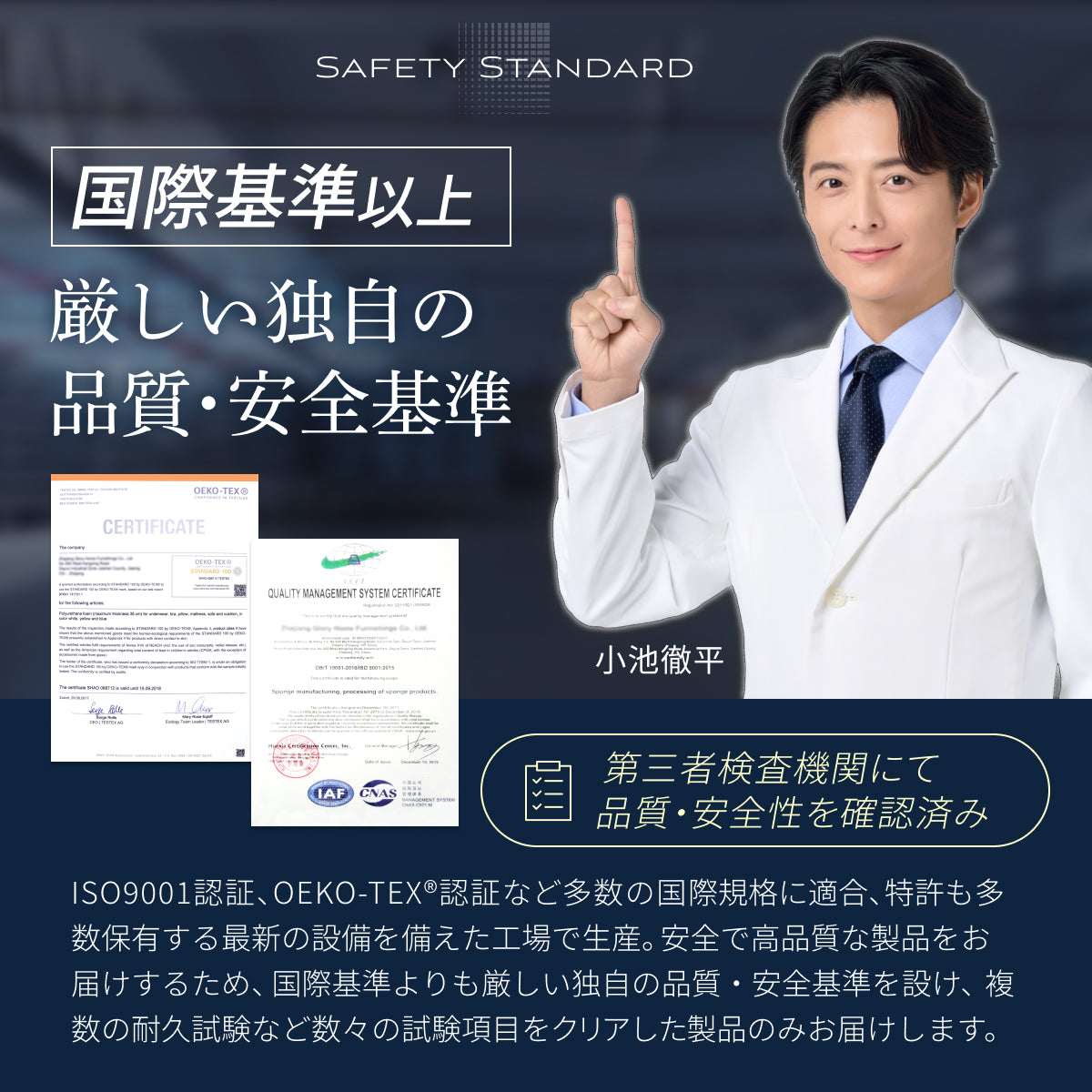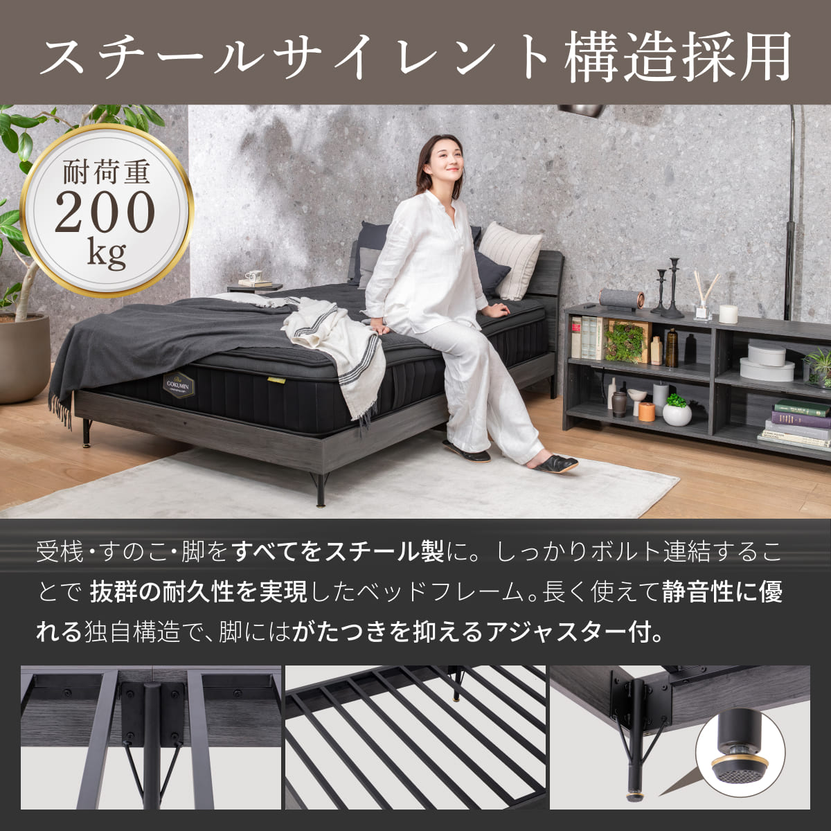 通常は木製部品が多いベッドフレームですが、内部にはスチール部品を多く使用しており、優れた静音性と安定感で静かな眠りをサポートします。また、天然木を使用していないため、反りやカビの心配がなく、長期間ご使用いただけます。高強度のスチールを採用し、耐荷重は安心の200kgです。