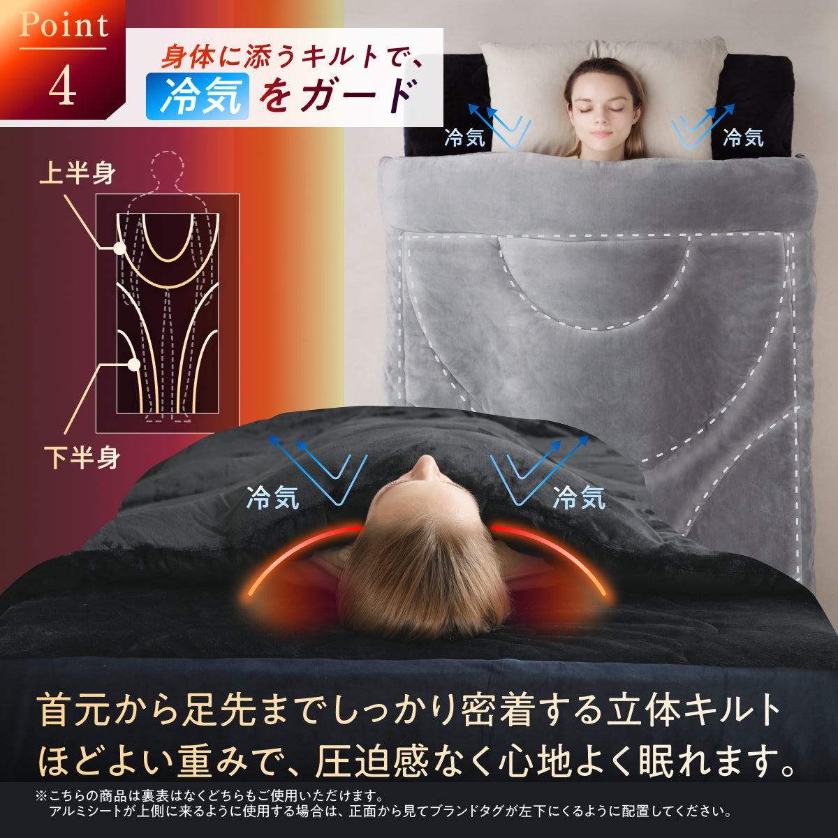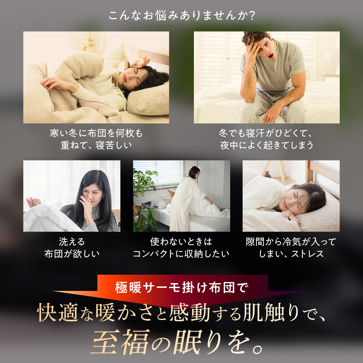 ●【側生地】ポリエステル85%、レーヨン15%【中綿】ポリエステル80%、アクリレート20%(アルミシート入り)【収納袋】ポリエステル100% ●高級化粧箱、取扱説明書●日本企業開発、中国専用工場生産